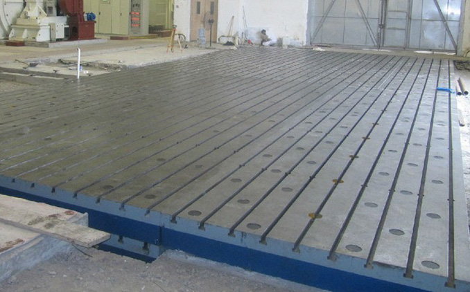 我公司為青島天藍化工廠設計制造的1500×3000mm焊接平臺8塊產品生產現場,焊接平板(焊接平臺)用于鉚焊工藝的基礎平板,工作面上有孔和T型槽,孔主要用來清理鉚焊時的一些鐵渣和焊接廢棄物,T型槽主要是用來固定焊接件。當然,焊接平板也有用平面的,即無孔無槽。